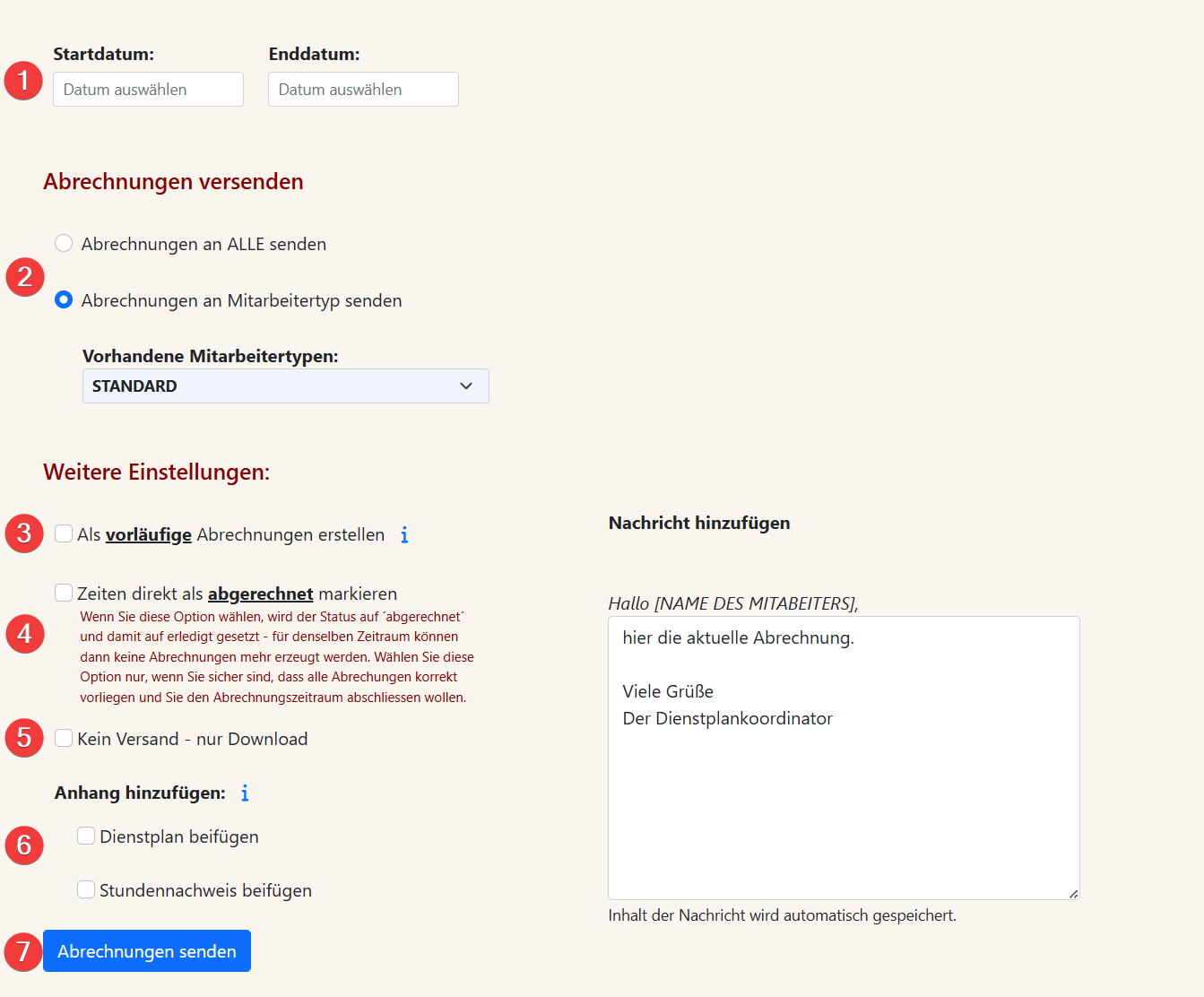 Mit diesem Schritt senden Sie die vorläufigen Abrechnungen an ihre Mitarbeiter/innen. Damit haben diese die Gelegenheit, die Abrechnungen zu prüfen und können ggf. fehlende/falsche Planungen vor der eigentlichen Abrechnung reklamieren.